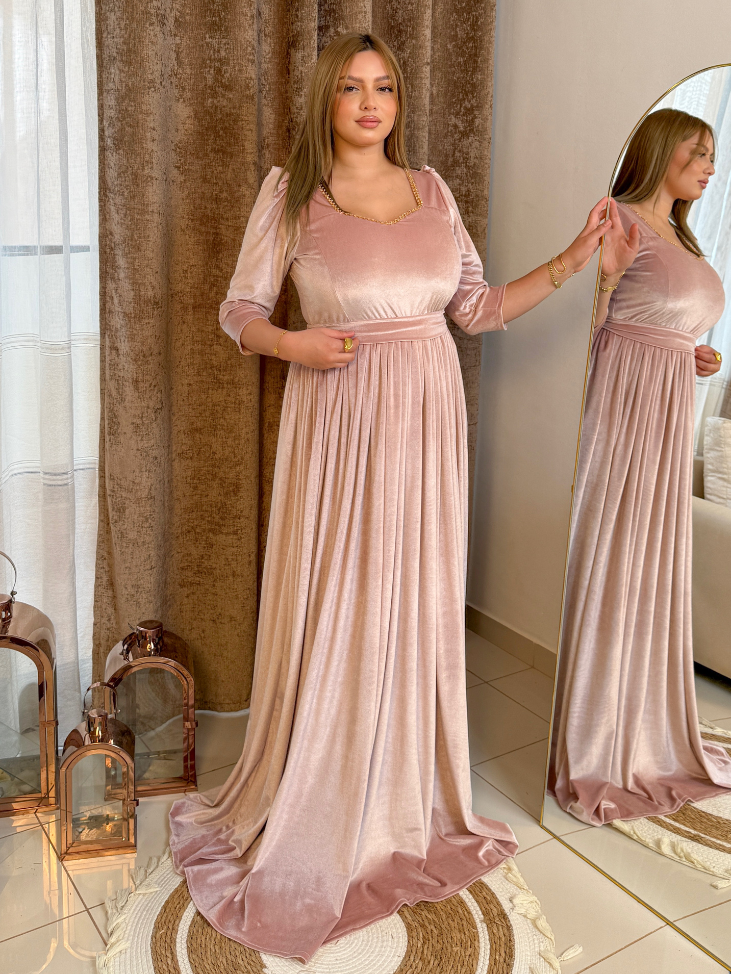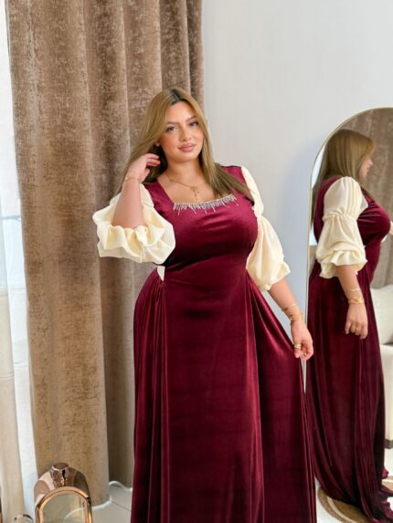 الياقة مربعة ناعمة مزينة بتطريز ذهبي رقيق يبرز جمال العنق، مع أكمام متوسطة الطول تضيف توازنًا مثاليًا بين الاحتشام والرقي.